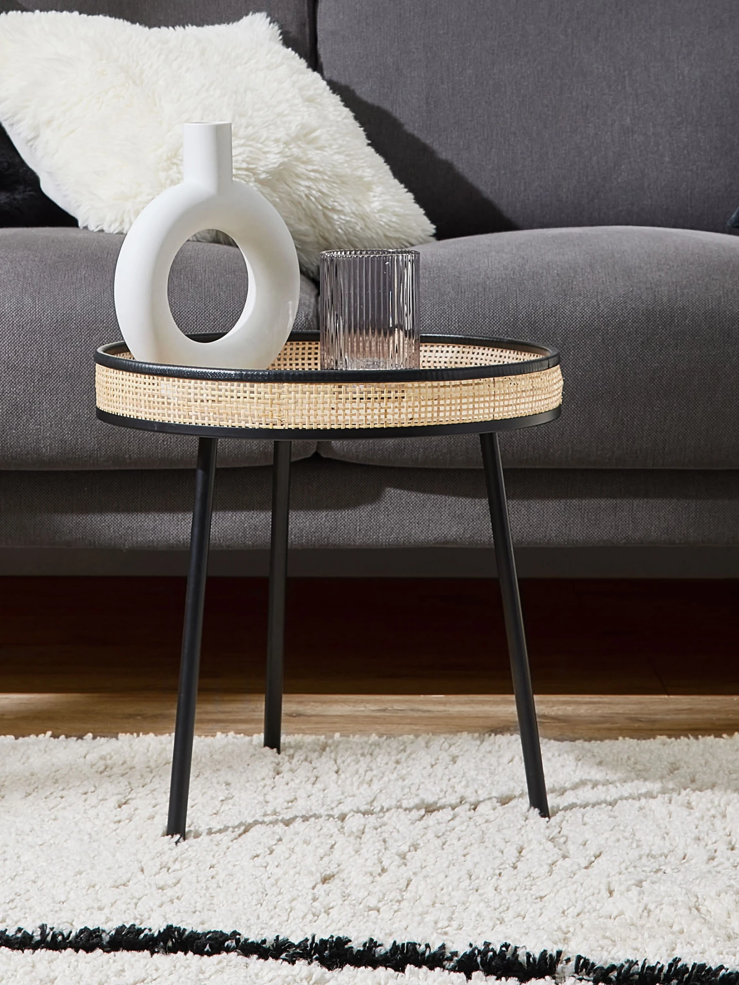 Runder Tisch mit attraktiver Rattan-Umrandung. Tischbeine aus Metall.