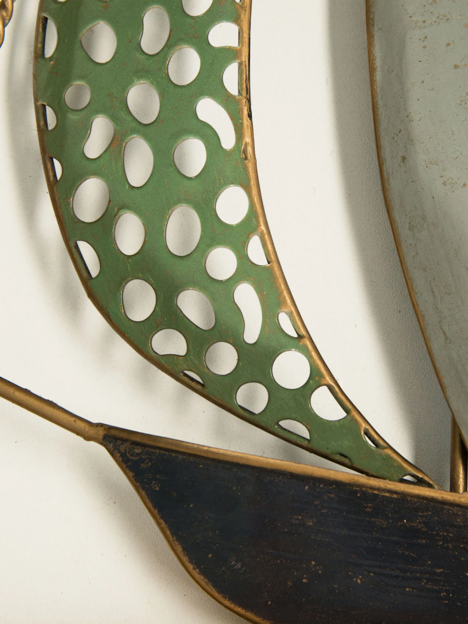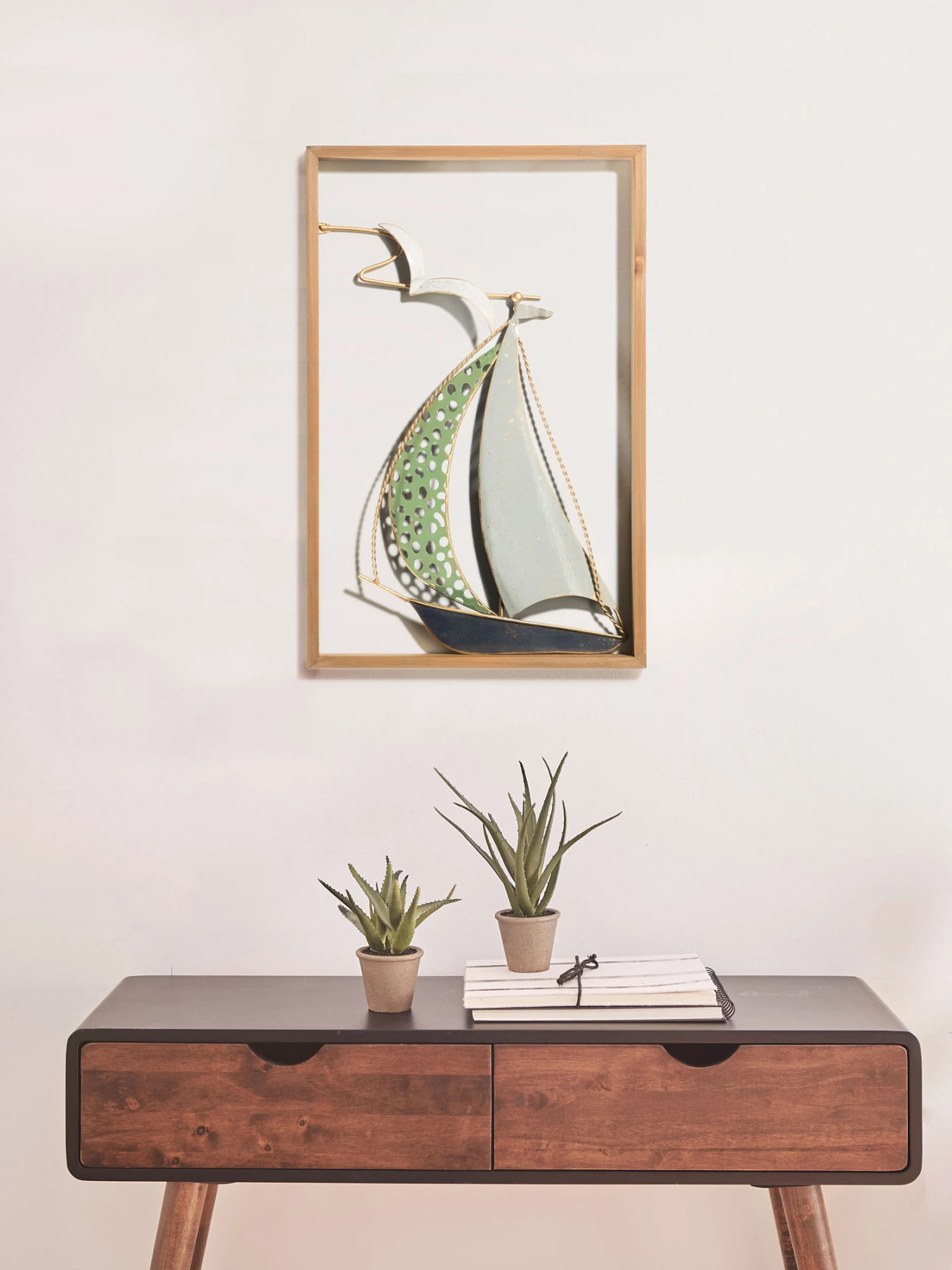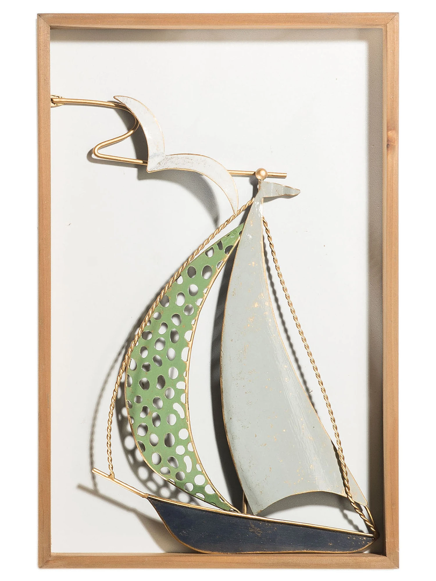 Wandobjekt aus Metall im Holzrahmen. Kunstvoll und aufwendig gestaltetes Segelboot mit plastischen Effekten. Größe: ca. 31,5 x 29,5 x 43,5 cm. Inklusive Aufhängung.